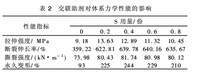 (2)體系拉伸強度隨S用量的增加先升高后降低,而S的加入對撕裂強度的影響不大,當m(DCP)/m(S)=2/0.2時,體系的綜合力學性能最佳。