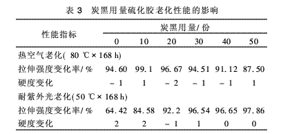 (4)炭黑的加入使體系的抗紫外性能明顯改善,而過多的炭黑不利于試樣的耐熱老化性。