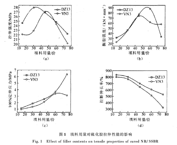 (2)與炭黑DZ13硫化膠相比,白炭黑VN3硫化膠的定伸應(yīng)力、硬度較低,拉斷伸長(zhǎng)率較高,生熱低,用量高于45份時(shí)拉伸強(qiáng)度相當(dāng),撕裂強(qiáng)度較低,但75份時(shí)撕裂強(qiáng)度較高。