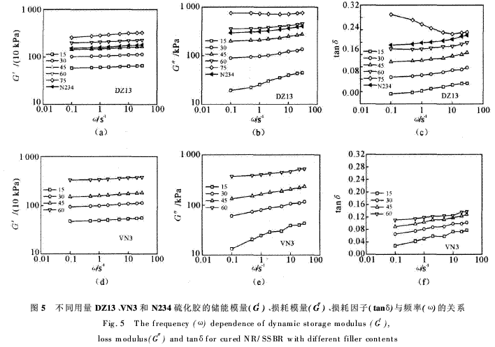 與G′不同,G″的頻率依賴(lài)性隨填充量增加而發(fā)生明顯變化。填充15~60份DZ13時(shí)硫化膠的G″隨頻率增加而增加,而填充75份DZ13時(shí)硫化膠的G″隨頻率增加而稍有下降,這種差別在tanδ~ω曲線中更加明顯,表明此時(shí)硫化膠的填料網(wǎng)絡(luò)發(fā)生了變化,分析認(rèn)為這是由于高填充量時(shí)炭黑網(wǎng)絡(luò)在高頻下被破壞所致。VN3硫化膠的tanδ比DZ13硫化膠小很多,表明白炭黑網(wǎng)絡(luò)對(duì)鏈段或分子鏈的限制作用比DZ13弱,分子鏈之間的內(nèi)摩擦少,損耗也會(huì)相應(yīng)較低。