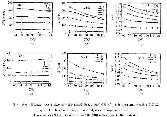 由圖7可以看出,低DZ13填充量硫化膠的G′~T曲線基本符合交聯(lián)網(wǎng)絡(luò)彈性理論,G′隨T上升而增加,而高填充量硫化膠已經(jīng)不符合“仿射”變形等假設(shè),G′隨T上升而略有下降。彈性模量主要由填料及其網(wǎng)絡(luò)提供的[1],G′下降可能與高溫下動(dòng)態(tài)應(yīng)力加速炭黑凝膠網(wǎng)絡(luò)的破壞有關(guān)。然而所有15~60份VN3填充硫化膠G′~T曲線都符合交聯(lián)網(wǎng)絡(luò)彈性理論。