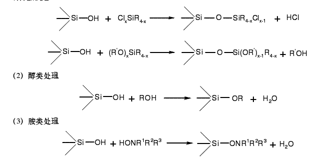 經(jīng)過(guò)表面處理后,降低了氣相法白炭黑表面硅羥基數(shù)量,提高了其與有機(jī)物的相容性以及分散性,使氣相法白炭黑粉體表面產(chǎn)生新的物理、化學(xué)、機(jī)械性能。理論上只要能夠與硅羥基反應(yīng)的物質(zhì)都可以用作氣相法白炭黑的表面處理劑,工業(yè)上常用的是有機(jī)硅烷(二甲基二氯硅烷、八甲基環(huán)四硅氧烷、三甲基氯烷,有機(jī)硅氧烷、有機(jī)硅氮烷和有機(jī)鹵硅烷等),胺類化合物和醇類化合物。其原理如下:
