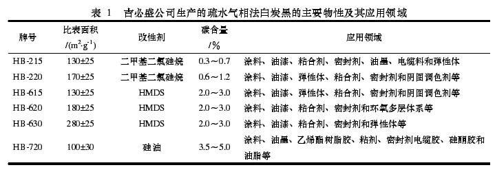 通過(guò)碳含量的測(cè)定可以定量判斷氣相法白炭黑表面改性效果的好壞。當(dāng)然,利用不同改性劑處理不同比表面積的氣相法白炭黑,其改性后的碳含量是不同的。表1給出了吉必盛公司生產(chǎn)的改性后的氣相法白炭黑(疏水氣相法白炭黑)的主要物性及其應(yīng)用領(lǐng)域。