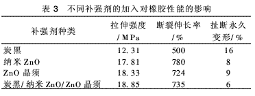 通過以上兩步實(shí)驗(yàn),分別優(yōu)選出炭黑/納米ZnO、炭黑/ZnO晶須的最佳用量配比,為研究炭黑/納米ZnO/ZnO晶須的協(xié)同補(bǔ)強(qiáng)效應(yīng),選擇上述優(yōu)選的最佳用量(炭黑/納米ZnO/ZnO晶須用量分別為30、12、10份,質(zhì)量比1∶0.4∶0.3),以炭黑/納米ZnO/ZnO晶須作為補(bǔ)強(qiáng)劑制得硫化膠,采用同樣參數(shù)進(jìn)行性能測試,不同補(bǔ)強(qiáng)劑對NBR的改性效果見表3。