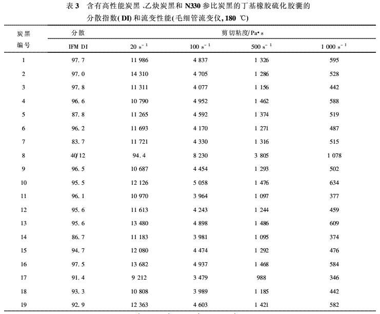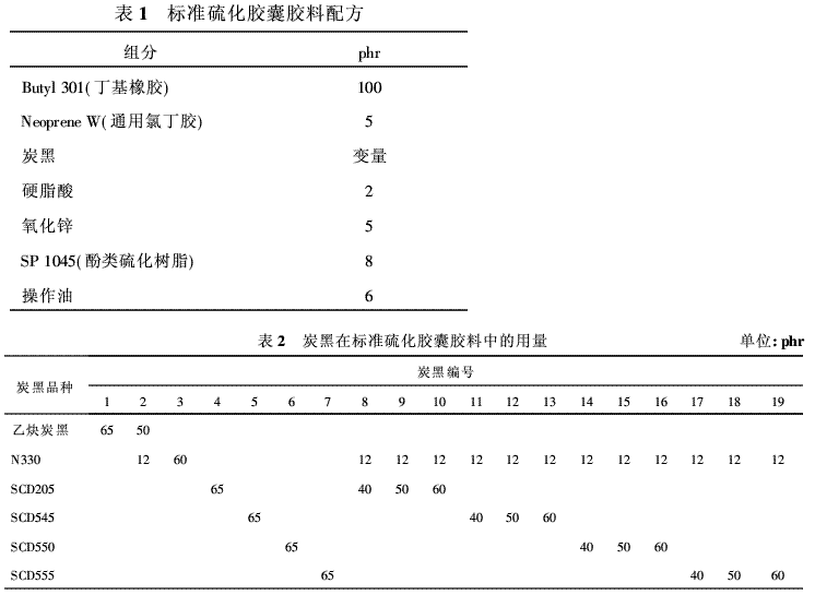 硫化膠囊中常用的炭黑有N300、N220、乙炔炭黑等,以及它們不同比例的并用體。高性能炭黑可替代乙炔炭黑,單獨(dú)使用或與N330并用。表2示出了該研究中所用的各種炭黑。