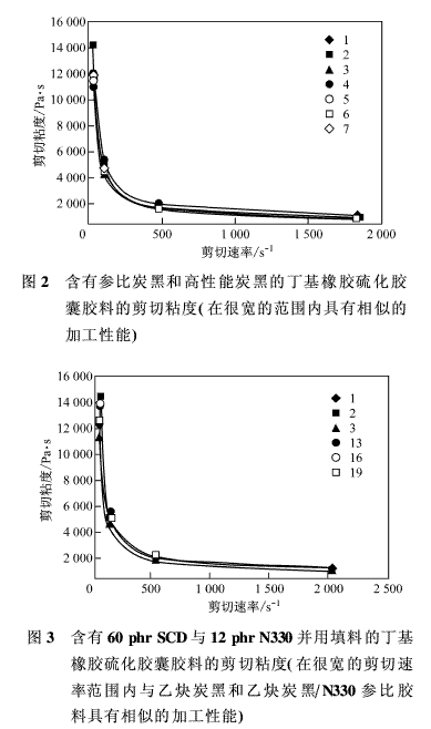 未硫化膠的流變性能用毛細(xì)管流變儀在20 s-1、100 s-1、500 s-1和1 000 s-1剪切速率下進(jìn)行了測定,表3中也列出了剪切粘度數(shù)據(jù)。圖2和圖3示出了參比膠料和各種含SCD級(jí)炭黑的膠料的剪切粘度與剪切速率的關(guān)系。從圖上看,很難發(fā)現(xiàn)參比膠料和SCD級(jí)炭黑在剪切粘度上有什么差別。但進(jìn)一步分析表明,總的來說,含SCD的膠料剪切粘度等于或低于3個(gè)參比膠料,僅有少數(shù)例外。