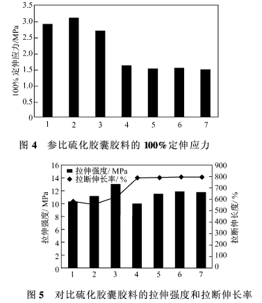 圖6和圖7分別示出了高性能炭黑與N330并用填充的膠料與參比膠料的100%定伸應(yīng)力、拉伸強(qiáng)度和拉斷伸長率的對比情況。正如所料,隨SCD用量的增大(N330用量固定在12 phr),定伸應(yīng)力增大。這些膠料的定伸應(yīng)力與含65 phr SCD的膠料很接近,說明12 phrN330提升定伸應(yīng)力的作用有限。由此可見,SCD與N330并用后可以提高膠料的定伸應(yīng)力,同時(shí)對硫化膠囊的加工性能和其他重要性能沒有影響。