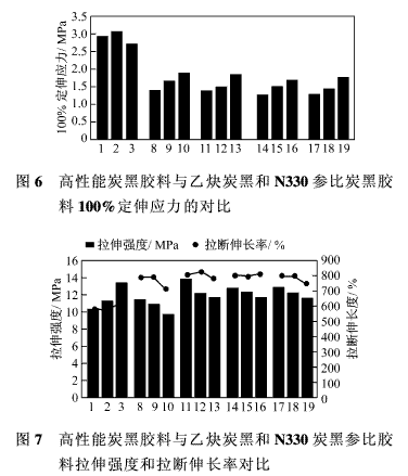 靜態(tài)應(yīng)力-應(yīng)變性能是檢驗(yàn)高性能炭黑相對于參比炭黑補(bǔ)強(qiáng)性能好壞的重要依據(jù)。參比膠料和未并用SCD補(bǔ)強(qiáng)膠料的100%定伸應(yīng)力、拉伸強(qiáng)度和拉斷伸長率示于圖4和圖5。由圖4可見,含1號(hào)炭黑和2號(hào)炭黑膠料的定伸應(yīng)力相近,2號(hào)因加入了表面活性較大的N330,較1號(hào)稍有增大。但是,僅含N330(3號(hào)炭黑)的膠料的定伸應(yīng)力有所下降,這可能是因?yàn)槠浣Y(jié)構(gòu)較低,且用量稍小。與參比膠料相比,65phr含SCD(4~7號(hào))的膠料的100%定伸應(yīng)力顯著下降,這可能是由于經(jīng)過熱處理后其表面活性降低了。定伸應(yīng)力與炭黑的結(jié)構(gòu)和表面活性相關(guān),這些結(jié)果也表明炭黑表面活性對于定伸應(yīng)力的重要性。圖5示出了65phr SCD填充膠料和參比膠料的拉伸強(qiáng)度和拉斷伸長率數(shù)據(jù),數(shù)據(jù)表明,所有膠料的拉伸強(qiáng)度相當(dāng),含SCD(4~7號(hào))的膠料稍低,但拉斷伸長率較高,因?yàn)槠淠A枯^低。