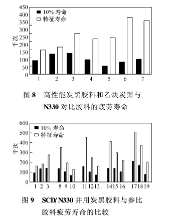在恒定峰-峰應(yīng)變(0~100%伸長)下測定膠料的特征疲勞壽命,結(jié)果繪于圖8和圖9。用Weibull方法對數(shù)據(jù)進(jìn)行了分析。由圖8可見,與1號(hào)炭黑和2號(hào)參比膠料相比,SCD填充膠料的疲勞壽命較長一些,這可能主要是由于這些膠料模量較低,所以在恒應(yīng)變(0~100%)條件下輸入的能量較少。人們也許會(huì)認(rèn)為,與拉伸性能的情況一樣,SCD炭黑表面惰性引發(fā)裂紋的機(jī)率可能更大一些,但實(shí)際上,6號(hào)炭黑填充膠料在該組中的疲勞壽命是最長的。