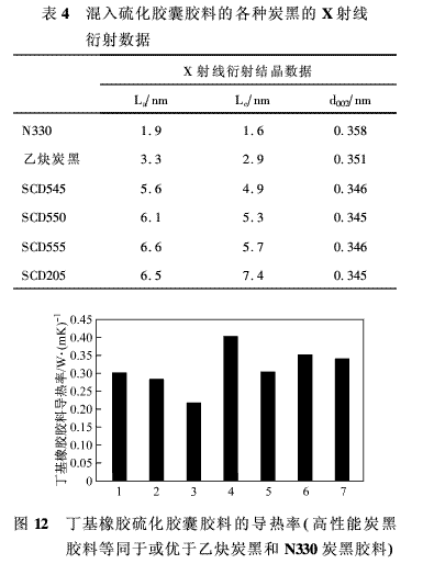 應(yīng)當(dāng)注意到,炭黑形態(tài)的差別可能對導(dǎo)熱性也有影響。但是,也有研究表明,含有從熱裂法到高導(dǎo)電各種炭黑的丁基橡膠膠料,其導(dǎo)熱率差異僅約15%。除了這兩種特種炭黑,ASTM橡膠爐法炭黑之間的導(dǎo)熱率差異更小(約8%)。研究還表明,丁基橡膠硫化膠囊在100℃下的導(dǎo)熱率與膠囊實(shí)際使用時(shí)的高溫下的導(dǎo)熱率差異很小,甚至無差異。