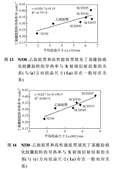圖13和圖14示出了硫化膠囊膠料的導(dǎo)熱率與各個(gè)炭黑X射線衍射性能的關(guān)系(La:平均石墨層尺寸,Lc:平均晶粒堆徹高度),再次證明了炭黑微結(jié)構(gòu)序列與膠料導(dǎo)熱性增加的直接關(guān)系。