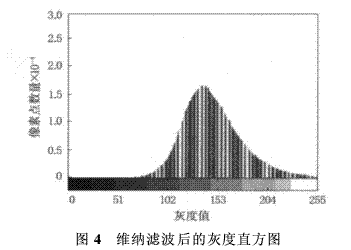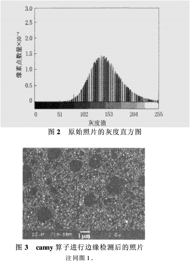 由于SEM在成像過程中受到入射電子本身的波動性以及成像過程中其它因素(如球像差、像散、外界震動、電噪聲和統(tǒng)計漲落噪聲等)的影響,因此圖像中夾雜噪聲在所難免。從原始照片的灰度直方圖上可以看到有毛刺現(xiàn)象,這在一定程度上會影響試驗結(jié)果的精確度。一般使用平滑濾波可以抑制噪聲的影響,本研究采用維納濾波進行去噪處理。維納濾波是一種線形平滑濾波,它是一種自適應(yīng)濾波,能根據(jù)圖像的區(qū)域方差來調(diào)整濾波器的輸出。在Matlab軟件中維納濾波對應(yīng)的命令為J=wiener 2(I,[m n]),通過m×n鄰域估算平均值和標準方差,默認值為3×3。維納濾波后的圖像灰度直方圖如圖4所示,與圖2比較,可以看出維納濾波的效果較好。