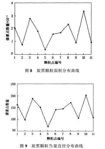 基于Matlab 7.0軟件,利用數(shù)學形態(tài)學的圖像處理方法,將炭黑粒子與背景分離,實現(xiàn)了炭黑微粒的尺寸測定,得出炭黑粒子面積和當量直徑大小分布曲線,彌補了人工識別方法的不足,為進一步評價炭黑粒子分散度提供了依據(jù)。該方法也適用于其它材料的微觀結(jié)構(gòu)分析。數(shù)學形態(tài)學相對于邊緣檢測和區(qū)域填充的空間局限性具有較大的優(yōu)越性。