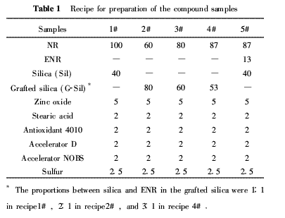 采用雙輥開煉機(jī)混煉膠料,配方如表1.前后輥的轉(zhuǎn)速比為1∶1·4,將NR(5#配方中還有ENR)包輥后,加入除促進(jìn)劑和硫磺的其它輔料,再加入40份當(dāng)量的白炭黑,翻煉數(shù)次,最后添加硫磺和促進(jìn)劑,混煉均勻,薄通數(shù)次后出片,制得混煉膠.混煉膠在150℃下按橡膠硫化儀測得t90的時(shí)間進(jìn)行硫化,制得復(fù)合材料樣品.