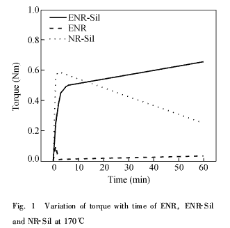 利用橡膠硫化儀對白炭黑與ENR之間的反應(yīng)溫度進(jìn)行確定[7~9].選取了3種樣品,ENR、填充白炭黑的ENR以及填充白炭黑的NR.圖1是在170℃下60min各體系扭矩隨時(shí)間的變化情況.ENR在整個(gè)過程中扭矩幅度很小的上升;而白炭黑填充的NR扭矩隨著時(shí)間的延長逐漸下降,這是因?yàn)镹R本身不能與白炭黑發(fā)生反應(yīng),在高溫下NR迅速降解,所以引起扭矩的下降;白炭黑與ENR混合體系的扭矩逐步增大,體系扭矩的增大一般是因?yàn)榘l(fā)生了某種交聯(lián)反應(yīng).