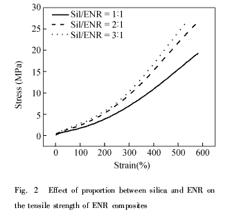 在確定白炭黑與ENR的反應(yīng)配比時(shí),主要考慮能否達(dá)到改性白炭黑的目的,即是否能更有效地改善白炭黑的增強(qiáng)性能.填料的增強(qiáng)性能通常以材料應(yīng)力-應(yīng)變曲線上的300%定伸強(qiáng)度來衡量,所以該研究主要是通過考察接枝白炭黑的增強(qiáng)性能來確定合適的改性配比.圖2是不同配比改性的白炭黑填充NR硫化膠的應(yīng)力-應(yīng)變曲線,從圖上可以明顯看出,并不是ENR相對含量越多對增強(qiáng)越有利,二者以1∶1的比例反應(yīng)時(shí),其增強(qiáng)效果反而較差,這可能與白炭黑粒子表面ENR包裹層太厚有關(guān),還有ENR經(jīng)高溫高剪切作用分子鏈變短,小分子量的ENR相對含量較多,主體天然膠的相對含量較少,這些因素都可能引起材料的強(qiáng)度降低當(dāng)反應(yīng)比例為2∶1時(shí),300%定伸強(qiáng)度相對1:1時(shí)有很明顯的改善,白炭黑的比例增為3∶1時(shí),增強(qiáng)性能雖然還有進(jìn)一步的提高,但提高的幅度就不是特別明顯了.由此可以判斷,3∶1的比例應(yīng)該是比較接近最佳的反應(yīng)配比條件了,因此后面的接枝表征和性能研究就使用該反應(yīng)配比制得的接枝白炭黑.