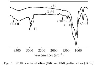 為了表征白炭黑經(jīng)過ENR接枝改性后表面化學(xué)結(jié)構(gòu)的變化,分別對接枝前后的白炭黑進(jìn)行了紅外光譜分析.圖3是ENR接枝白炭黑與未接枝白炭黑的紅外光譜圖.