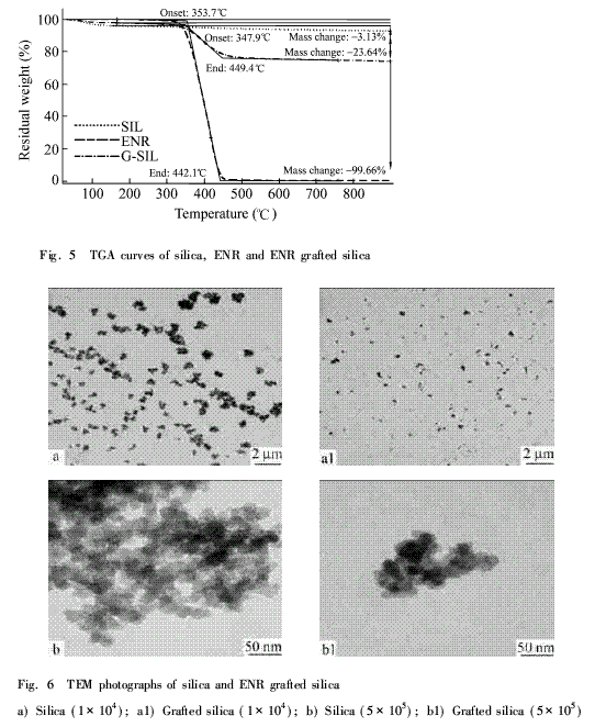 為了進(jìn)一步考察該方法ENR接枝率的大小以及接枝白炭黑的熱穩(wěn)定性,進(jìn)行了TGA分析.圖5分別是白炭黑,ENR和接枝白炭黑的TGA曲線,白炭黑的失重大體分為兩步,150℃之前是脫除吸附水,150℃之后開始脫除結(jié)合水;ENR的失重區(qū)域在353·7~442·1℃;接枝白炭黑除了包含白炭黑的兩階段失重外,在347·9~449·4℃的溫區(qū)出現(xiàn)一個(gè)明顯的失重臺階,是對應(yīng)于接枝的ENR的失重.這一臺階的失重為23·64%,在這一階段中因白炭黑自身脫水的失重量計(jì)算理論值約為2·34%,所以實(shí)際接枝的ENR含量為21·3%.這一方法的接枝率是比較高的,主要是因?yàn)榘滋亢诹W颖砻娓缓罅康牧u基,同時(shí)ENR主鏈上也含有大量的環(huán)氧基團(tuán),兩種基團(tuán)接觸的幾率非常大,只要ENR長鏈上有一個(gè)環(huán)氧基團(tuán)參與反應(yīng),整條ENR分子就可成功接枝到白炭黑粒子上.此外,從該圖上也反映出,ENR接枝后,熱降解起始溫度有所降低,這可能是因?yàn)榄h(huán)氧環(huán)被打開后,影響了分子鏈的熱穩(wěn)定性;但其失重的終止溫度更高,說明了熱穩(wěn)定性更高的界面層的存在.