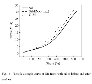 圖7是不同白炭黑增強(qiáng)體系的NR硫化膠的應(yīng)力-應(yīng)變曲線.3個(gè)體系分別是,未改性白炭黑,ENR接枝改性白炭黑和ENR共混改性白炭黑.從圖中可以看出,ENR接枝改性白炭黑的100%和300%定伸應(yīng)力比未改性白炭黑和ENR共混改性白炭黑要高.單純利用ENR共混改性白炭黑雖也能有效提高定伸應(yīng)力,但這主要是由于環(huán)氧基與硅羥基之間能形成氫鍵,與ENR接枝改性白炭黑中ENR與白炭黑通過共價(jià)鍵結(jié)合不同,所以定伸應(yīng)力低于后者.300%與100%“定伸應(yīng)力比”通常定義為填料的增強(qiáng)性能指數(shù),從拉伸曲線上可以直觀地反映出,三個(gè)體系中接枝白炭黑具有最高的增強(qiáng)性能.ENR接枝白炭黑能明顯改善白炭黑的增強(qiáng)效果,主要源于接枝后不僅改善了白炭黑在NR中的分散,而且白炭黑表面有機(jī)化接枝后,增強(qiáng)了白炭黑與NR基體之間的界面結(jié)合力.曲線上也反映出ENR接枝改性白炭黑體系的拉伸強(qiáng)度和伸長率略有降低,可能的原因主要是交聯(lián)密度過大導(dǎo)致的.