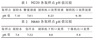 通過對(duì)制粒水、急冷水的跟蹤分析數(shù)據(jù),證明制粒水與急冷水的pH值均大于7.0,制粒機(jī)下料口炭黑的pH值均呈堿性,而干燥機(jī)出口炭黑pH值小于7.0,呈弱酸性。應(yīng)該說制粒水及急冷水不是導(dǎo)致炭黑pH值偏低的原因。
