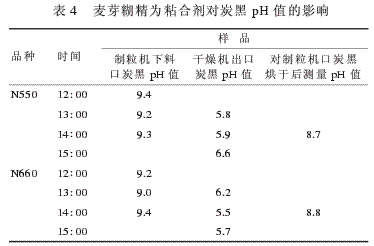 從表3可知,粘合劑糖蜜的pH值波動(dòng)較大,5%糖蜜沖泡液的pH值為2.9~5.4,制粒水pH值為4.4~7.2,純糖蜜放置一周后,pH值由原5.4下降至4.5。由此可見,粘合劑沖泡濃度不準(zhǔn),糖蜜影響制粒水pH值可能性較大,也可能會(huì)影響炭黑pH值偏低。