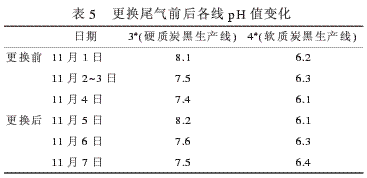 生產(chǎn)軟質(zhì)炭黑所產(chǎn)生的尾氣與生產(chǎn)硬質(zhì)炭黑所產(chǎn)生的尾氣其成份存在差異,為了驗(yàn)證尾氣的成份變化對(duì)炭黑pH值是否有影響,11月5日,將4#線(軟質(zhì)炭黑生產(chǎn)線)尾氣爐所用干燥尾氣改為由3#(硬質(zhì)炭黑生產(chǎn)線)提供尾氣,同時(shí)3#線尾氣爐干燥用尾氣改為由4#線炭黑生產(chǎn)尾氣提供。以觀察因尾氣成份的不同,導(dǎo)致pH值變化,更換尾氣前后各線pH值變化見表5。