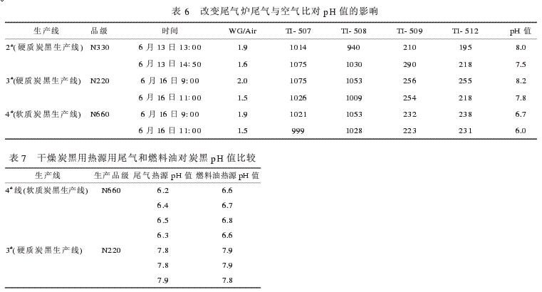 為了驗(yàn)證是否是因?yàn)槲矚庵心撤N成份會(huì)影響干燥炭黑的pH值,2005年12月,借助公司因煤氣緊張的矛盾,為了多獲得炭黑尾氣送焦?fàn)t作為焦?fàn)t的熱源而將干燥用炭黑尾氣爐改為用燃料油的機(jī)會(huì),收集了炭黑樣品并進(jìn)行炭黑pH值的分析,干燥炭黑用熱源用尾氣和燃料油對(duì)炭黑pH值比較結(jié)果見表7。