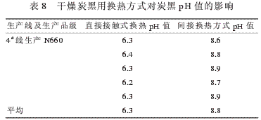 大多數(shù)炭黑廠在濕法炭黑干燥過程中均采取的是兩步干燥法,由尾氣爐出來(lái)的高溫燃余氣進(jìn)入干燥箱,先與濕炭黑粒子進(jìn)行間接換熱,當(dāng)燃余氣溫度降低到一定程度后,通過滾動(dòng)干燥機(jī)壁上的孔進(jìn)入滾動(dòng)干燥機(jī)內(nèi),與炭黑進(jìn)行直接換熱,將炭黑的水份除去。為了改善炭黑的pH值,采取增長(zhǎng)干燥機(jī)的直徑與長(zhǎng)度,對(duì)干燥機(jī)內(nèi)部結(jié)構(gòu)進(jìn)行改造的方式,讓燃余氣與炭黑進(jìn)行間接換熱。通過對(duì)炭黑pH值的跟蹤,確定影響炭黑pH值的因素。直接換熱與間接換熱方式對(duì)炭黑pH值的影響見表8。