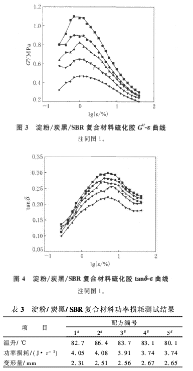 從表3可以看出,總體來說,與炭黑/SBR膠料相比,淀粉/炭黑/SBR復(fù)合材料的動態(tài)生熱和變形有所增大,功率損耗減小;隨著淀粉用量的增大,淀粉/炭黑/SBR復(fù)合材料的動態(tài)生熱和功率損耗呈降低趨勢,變形量呈增大趨勢。分析原因認為,隨著淀粉用量的增大,復(fù)合材料的模量減小,定負荷時的變形量增大,可能導(dǎo)致動態(tài)生熱增大,但同時炭黑用量減小,炭黑網(wǎng)絡(luò)結(jié)構(gòu)被削弱,炭黑聚集體破壞和重組的幾率降低,復(fù)合材料的動態(tài)生熱降低,由于炭黑因素對生熱的貢獻較大,因此綜合作用導(dǎo)致復(fù)合材料生熱降低。