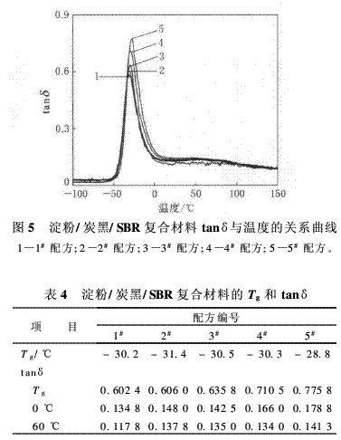 抗?jié)窕阅芡ǔS?℃時的tanδ表征,限于橡膠加工分析儀的測試范圍,采用動態(tài)粘彈測試儀對淀粉/炭黑/SBR復(fù)合材料進行測試,結(jié)果如圖5和表4所示。