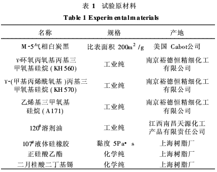 氣相白炭黑經(jīng)硅烷偶聯(lián)劑處理后,在高速攪拌機作用下加入到107#液體硅橡膠中,得到補強的混合膠液?;旌夏z加入交聯(lián)劑正硅酸乙酯、催化劑二月桂酸二丁基錫,室溫下攪拌使其硫化,抽真空制作試樣。