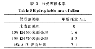 不同偶聯(lián)劑處理后白炭黑的疏水性測試結(jié)果見表3。