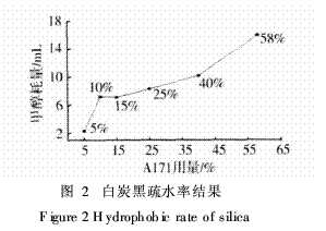 采用A171為處理劑,研究不同用量A171對白炭黑疏水性的影響,結(jié)果如圖2。