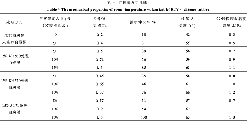 由表4可知,加入白炭黑后,硅橡膠力學(xué)強度明顯提高。加入表面處理后的白炭黑的室溫硫化硅橡膠的拉伸強度、扯斷伸長率、硬度等力學(xué)性能均有較大幅提高。拉伸強度和扯斷伸長率隨處理后的白炭黑的加入量增加而增大,說明偶聯(lián)劑處理后白炭黑的補強效果好。其中加入A171處理后的白炭黑的室溫硫化硅橡膠的力學(xué)性能最好,這與前述的疏水性能的結(jié)果比較吻合,說明A171處理后的白炭黑與液體硅橡膠107膠的相容性最好。加入15%A171處理的白炭黑用量15%的RTV硅橡膠硫化后拉伸強度最大能達到1. 5MPa,由其配制的膠粘劑對金屬與硅橡膠板的粘接強度達到1. 3MPa。