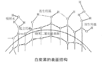 電子顯微鏡圖片研究表明:白炭黑是SiO2的無定形結構,以Si原子為中心,O原子為頂點所形成的四面體不規(guī)則地堆積而成。它表面上的Si原子并不是規(guī)則排列,連在Si原子上的羥基也不是等距離的,它們參與化學反應時也不是完全等價的。紅外光譜研究表明:白炭黑表面上有三種羥基,一是孤立的、未受干擾的自由羥基;二是連生的、彼此形成氫鍵的締合羥基;三是雙生的,即兩個羥基連在一個Si原子上的羥基。孤立的和雙生的羥基都沒有形成氫鍵。白炭黑的表面結構如下圖所示[4]。