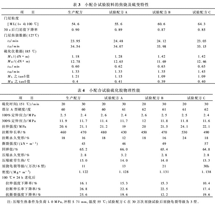 從表4可以看出,與生產配方膠料相比,試驗配方膠料抗撕裂強度和抗屈撓性能明顯提高,壓縮疲勞溫升有所降低,從老化后強度、拉斷伸長率和抗撕裂強度的下降率來看,耐老化性能有所提高,其它性能基本相當。
