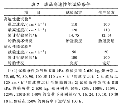 結合公司試驗安排,為了合理地利用資源,我們將試驗胎肩膠和另一試驗胎冠配方的胎冠膠同時進行成品試驗并與生產配方成品進行對比,生產10·00-20 16PR試驗輪胎6條,從中選取兩條分別進行高速和耐久性能試驗,試驗結果見表7。