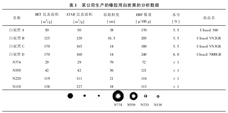 表1是某公司生產(chǎn)的具有代表性的橡膠用 白炭黑分析數(shù)據(jù)。為了進行對比,還把炭黑的 若干個ASTM數(shù)據(jù)一并列出。
