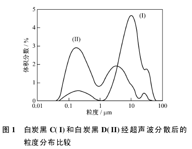 由于二氧化硅表面的高極性及與氫鍵的成 鍵能力,白炭黑聚集體能形成附聚物。在混煉 中由于剪切力作用產(chǎn)生的白炭黑的分散性,可 根據(jù)超聲波處理附聚物的易碎程度進行推斷。對水溶液中的白炭黑進行超聲波分散后,可借 助激光繞射測定粒度分布。結(jié)果如圖1所示。 由圖可見,與白炭黑C相比,作為高分散性白 炭黑的白炭黑D的小粒徑聚集體數(shù)量有大幅度增加。結(jié)果表明,白炭黑D有優(yōu)良的分散 性。