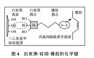 一旦將單官能團的硅烷偶聯(lián)劑—烷氧基硅 烷與二氧化硅偶合,就能在白炭黑表面產(chǎn)生疏 水性,從而使白炭黑網(wǎng)狀結(jié)構大幅度減少,粘度 降低,進而改善了加工性及硫化特性。但是,由于缺乏較強的白炭黑/橡膠的相互作用,這樣, 被處理過的白炭黑的補強性在大多數(shù)情況下依 然不能滿足要求。為了能滿足所要求的補強特性,必須在白 炭黑和橡膠之間生成化學鍵;若能使用雙官能 團的硅烷偶聯(lián)劑,就可以形成這種化學鍵。圖 4中示出了含硫黃官能團硅烷偶聯(lián)劑的白炭黑-硅烷-橡膠的化學鍵。