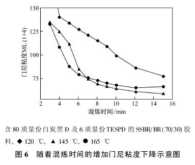 在橡膠母膠中有水分存在的情況下,分子 間縮合會發(fā)生生成聚硅氧烷的副反應中,所生 成的聚硅氧烷在橡膠中的活動性差,結(jié)果就有 可能使硅烷化的反應效率降低。一旦混煉溫度過高,硅烷化反應就有可能 以比白炭黑分散還要快的速度進行下去,這將 導致硅烷化處理不均勻,其結(jié)果會使二氧化硅 網(wǎng)狀結(jié)構增加,隨之而來的是補強性降低?;鞜捴械墓柰榛磻倪M行狀況,可以根 據(jù)混煉時產(chǎn)生的Payne效應,或者用降低門尼 粘度的辦法進行監(jiān)控。如圖6所示,在120℃ 下,反應速度較為遲緩,經(jīng)過15min后還是沒 有完成。在145℃下硅烷化處理的速度提高, 在7~8 min之后基本上就完成了。若在165℃ 下反應速度更快了。門尼粘度在達到145℃時 仍未見到下降,這表明,硅烷化處理反應有可能是不均勻的。