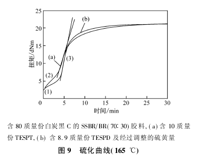 TESPD及TESPT在硫化中基本上是起著硫 黃接受體的作用。只有長鏈的多硫化物在硫化 中才能成為給予體。在使用純二硫化物硅烷的 情況(例如,TMTM之類的硫化促進劑)下,如果不增加硫黃量,交聯(lián)反應就不能進行。含TESPT膠料及含TESPD膠料的硫化曲 線如圖9所示。在測定開始時,無論使用哪一 種硅烷,都可以看出,隨著白炭黑發(fā)生再凝聚, 扭矩值會有一定的升高[1]。TESPT的初始扭矩值升高要比TESPD的要大些(z)。這是由 TESPT中的多硫化物引起的。在用硫化促進劑 活化之后,母膠的交聯(lián)和白炭黑-橡膠偶合就同 時發(fā)生了(3)。TESPD的耐焦燒穩(wěn)定性高,硫化速度快,在混煉時,其耐早期焦燒性成為TESPD 在加工方面一個十分突出的優(yōu)點。