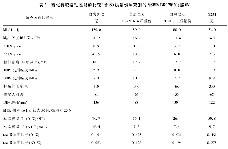 如表3所示,與使用未經(jīng)過處理的白炭黑 及白炭黑與丙基三乙氧基硅烷PTEO的組合那 樣,不存在硅烷/橡膠鍵的情況相比,白炭黑和 TESPT的組合可使模量以及耐磨耗性得到大幅改善,這種膠料的補強性超過同樣使用炭黑 N234的膠料,并且還能使tanδ降低。