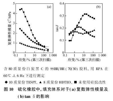 在加入炭黑時,這種固定化主要是通過橡 膠強有力的物理吸附起作用的,而在白炭黑-硅 烷填充劑體系中,白炭黑和橡膠的相互作用比 較弱,所以,就借助于化學鍵使橡膠固定在白炭黑的表面及白炭黑結(jié)構中。這種“化學性的”固 定會造成動態(tài)彈性模量大幅上升。在硫化時, 依靠白炭黑與橡膠的結(jié)合,橡膠內(nèi)結(jié)構和橡膠 自身的網(wǎng)絡這兩種網(wǎng)絡結(jié)構形成。白炭黑的網(wǎng)狀結(jié)構本身的模量也會產(chǎn)生影 響(圖7)。和其它因素不同,這種網(wǎng)狀結(jié)構與 強烈變形存在著相關性。由于應變破壞了網(wǎng)狀 結(jié)構,于是便發(fā)生了滯后損失。圖8是復數(shù)彈性模量和損耗因子tanδ與應變的相互關系示 意圖。從圖8可以看出,假如把白炭黑D和 TESPT配合使用的話,其Payne效應和tanδ就 比單獨使用炭黑與白炭黑D的要小。究其原因,白炭黑與橡膠的互相作用較小,發(fā)生化學固 定的橡膠,即便是在高應變范圍內(nèi)也是非常穩(wěn) 定的,而且白炭黑網(wǎng)狀結(jié)構由于硅烷化反應還 出現(xiàn)了大幅減少的現(xiàn)象。