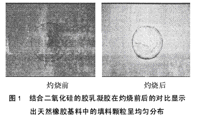 圖1是含有原位沉淀二氧化硅的橡膠樣品在馬福爐中灼燒前與灼燒后的對比照片。經(jīng)過灼燒,橡膠被完全燒盡,殘留物為二氧化硅。由圖中我們可以看到,含有原位沉淀二氧化硅的橡膠樣品中添料呈網(wǎng)狀結(jié)構(gòu)均勻分布。使用常規(guī)二氧化硅和VN3的樣品經(jīng)過灼燒,樣品發(fā)皺,顯示出加入常規(guī)二氧化硅和VN3的樣品中并不存在均勻分布的網(wǎng)狀結(jié)構(gòu)。