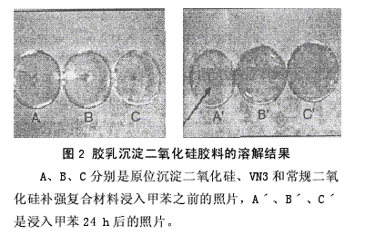 圖2是含有常規(guī)二氧化硅和VN3的樣品在甲苯中完全溶解的現(xiàn)象圖。相對于含有常規(guī)二氧化硅和VN3的樣品能夠完全溶解,含有原位沉淀二氧化硅的樣品在甲苯中形成一個溶脹膠團(tuán)。這種現(xiàn)象表明,在有原位沉淀二氧化硅的樣品中,填料與聚合物之間的相互作用程度更大。