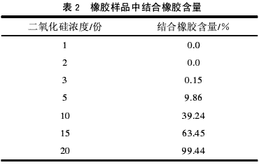 由表2可以看出,隨著原位沉淀二氧化硅含量的增加,結(jié)合橡膠的含量不斷增加,當(dāng)二氧化硅用量達(dá)到20份時,結(jié)合橡膠含量最大。含有此濃度的結(jié)合橡膠樣品,我們認(rèn)為是母煉膠。