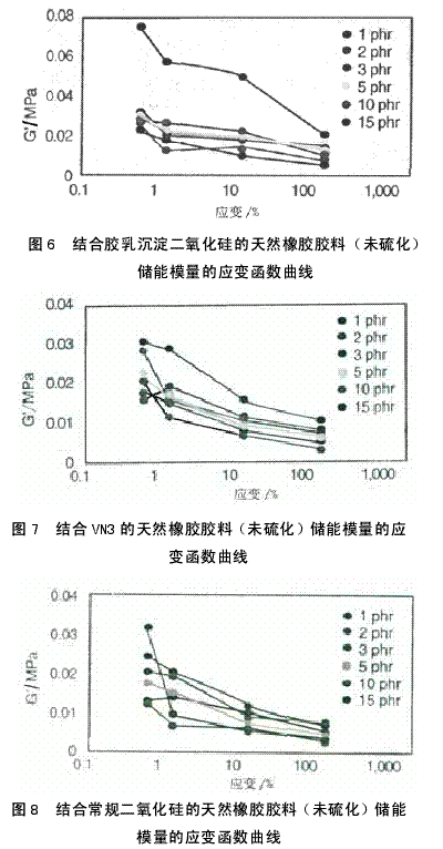 圖6顯示的是沉淀二氧化硅補強(qiáng)天然橡膠復(fù)合材料的未硫化樣品的儲能模量隨應(yīng)變掃描的變化。在未硫化的填充膠料中,生膠、流體動力學(xué)效應(yīng)、填料網(wǎng)狀結(jié)構(gòu)和聚合物填料間的相互作用均對Gˊ有影響。Gˊ值的差異除了與生膠和流體動力學(xué)效應(yīng)有關(guān),通過Gˊ值也可以反映出橡膠與填料之間的相互作用。由圖7和圖8可以明顯看出,VN3和常規(guī)二氧化硅補強(qiáng)的復(fù)合材料中橡膠填料間的相互作用力比乳液沉淀二氧化硅中的相互作用力低。所以新路線制得的復(fù)合材料有更高的模量與△G值,并具有更高的承載性能與橡膠填料間的相互作用力。