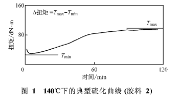 通過振動(dòng)圓盤流變儀(ODR),按±3°的角位移和1. 7 Hz的頻率,由140±2°C產(chǎn)生的硫化曲線確定焦燒時(shí)間和最適硫化時(shí)間。從這些硫化曲線計(jì)算出Δ扭矩(即最大扭矩與最小扭矩之差),見圖1。用前述方法計(jì)算出硫化速率指數(shù)。流變儀試驗(yàn)進(jìn)行了兩個(gè)小時(shí)。這些實(shí)驗(yàn)的結(jié)果匯總于表1。