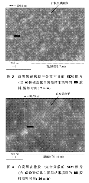 白炭黑粒子在橡膠內(nèi)的分散狀況,通過LEO 1530 VP場(chǎng)致發(fā)射槍掃描電子顯微鏡(SEM)來評(píng)定。在對(duì)SEM照片進(jìn)行檢測(cè)后,選擇合適的時(shí)間將填料和硫化劑加入橡膠中。